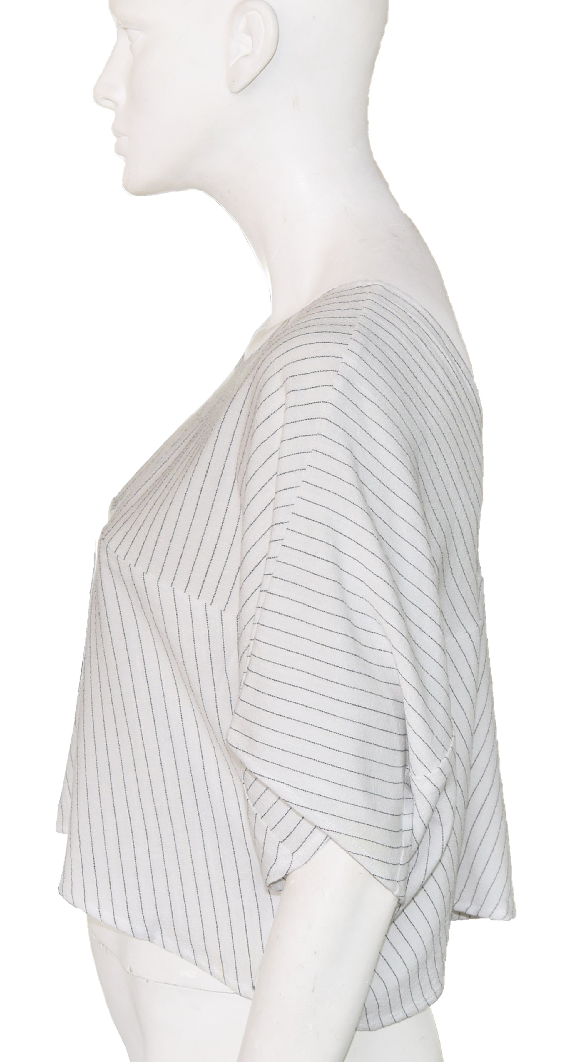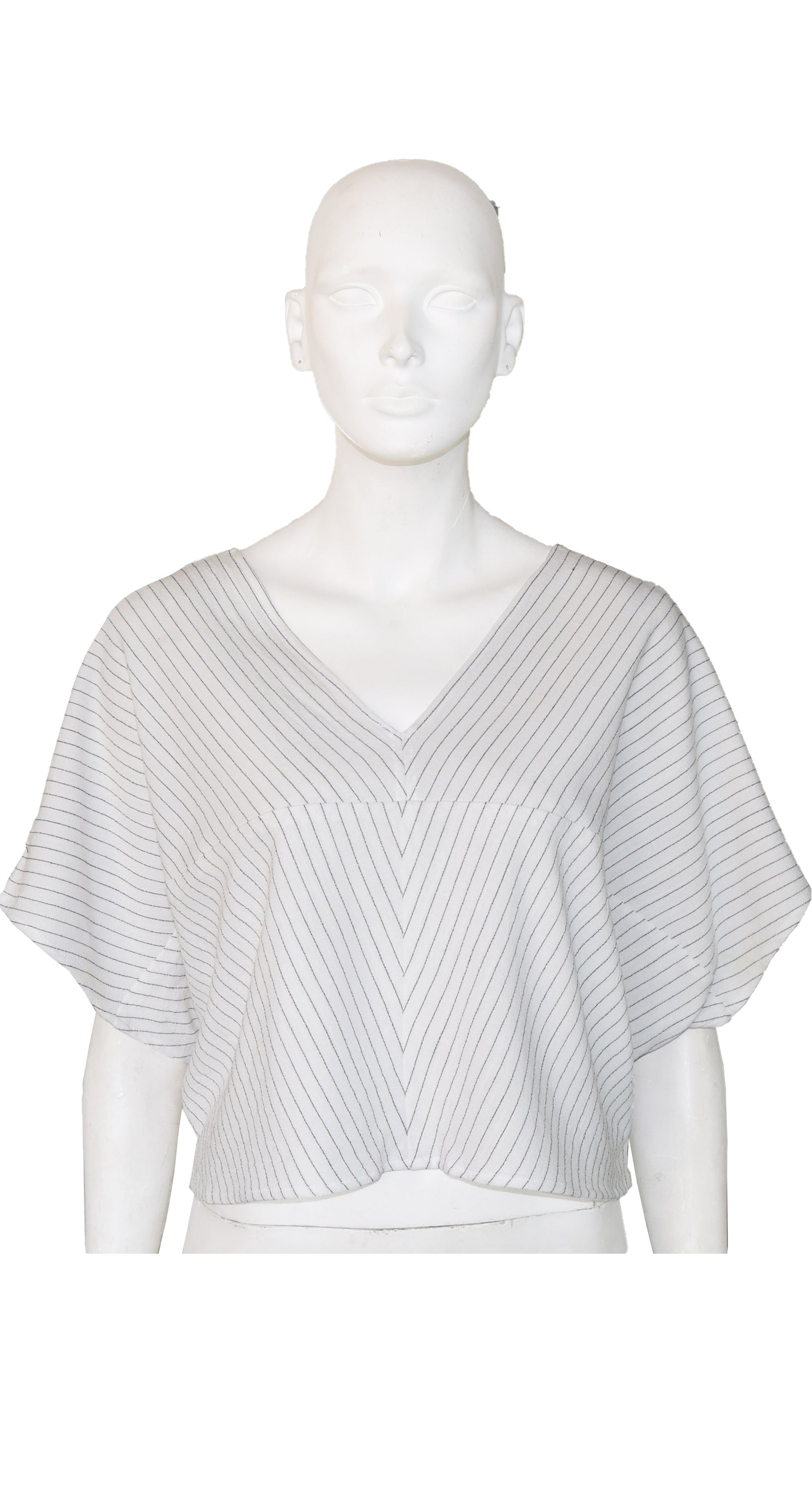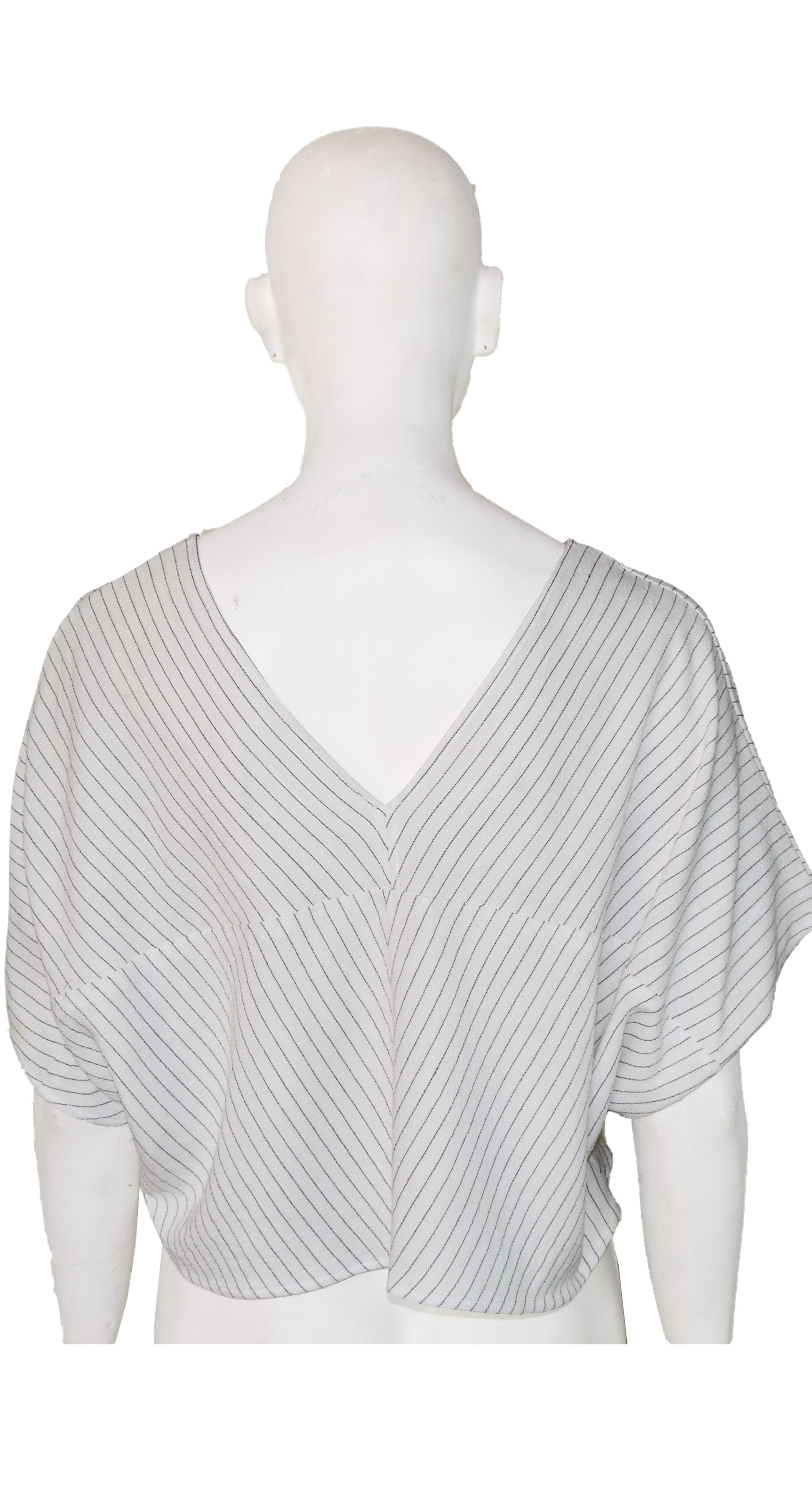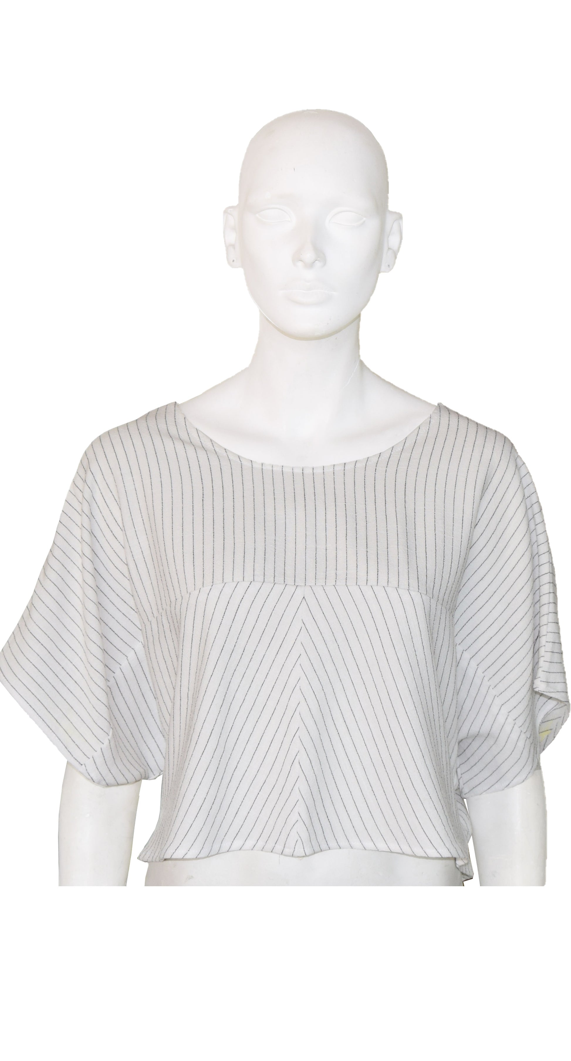 Crop Top oversize rectangular, con escotes en V y en redondo, se puede usar por ambos lados, tiene dos frentes, manga corta murciélago, cortes en las piezas que juegan con las líneas de la tela.