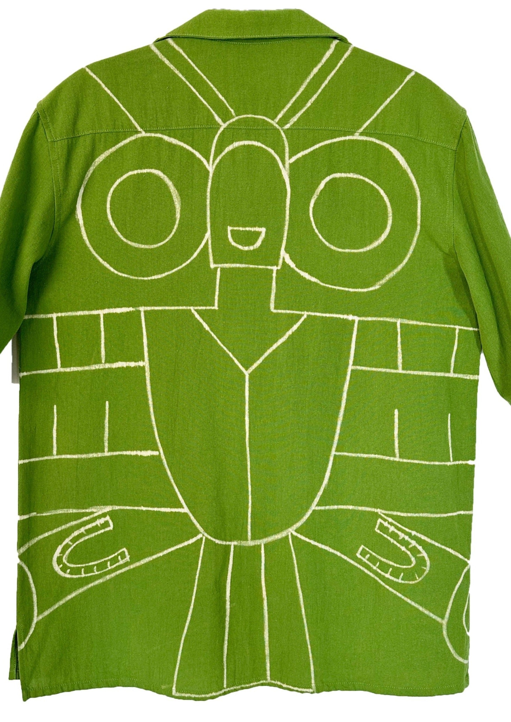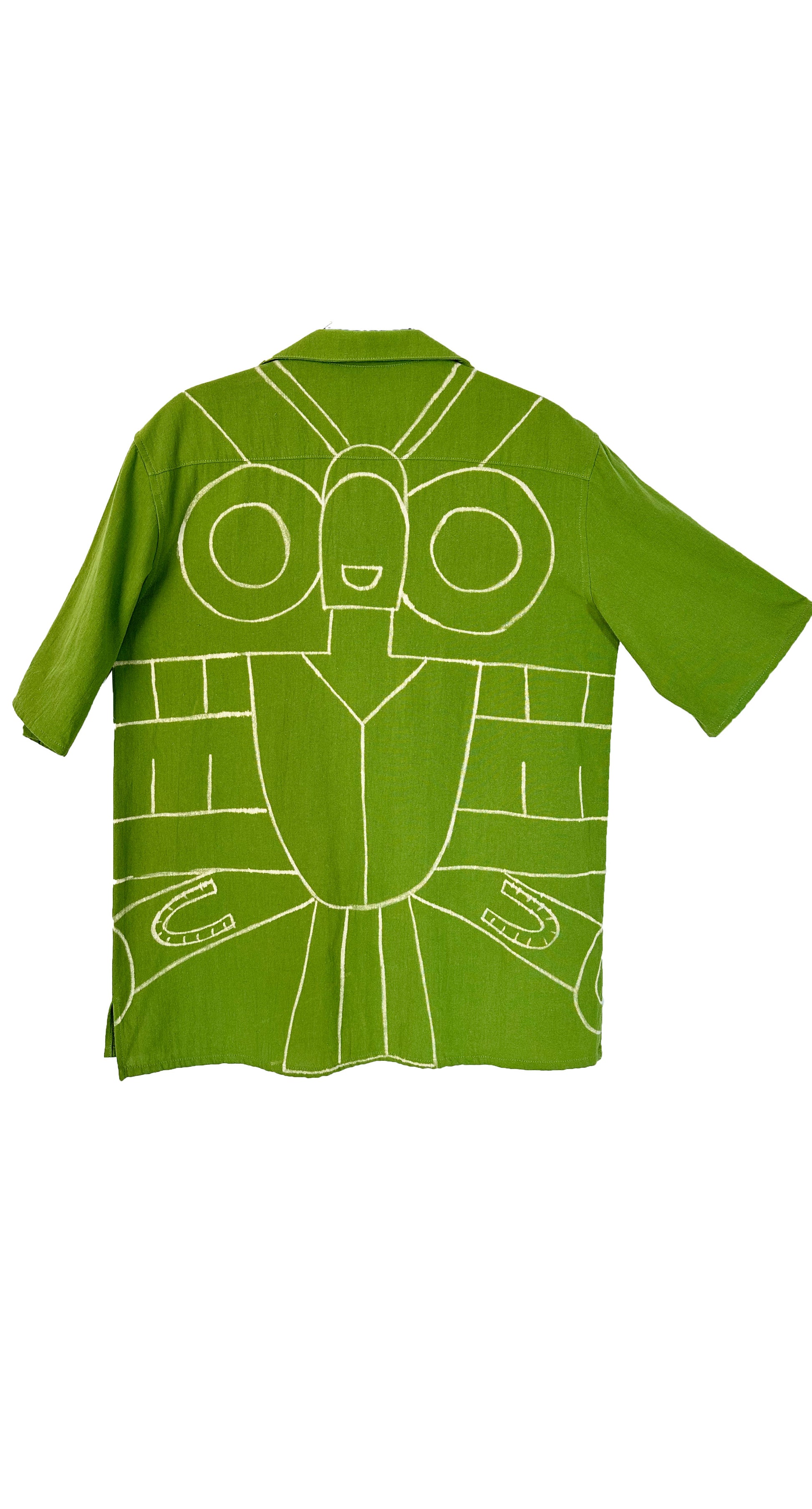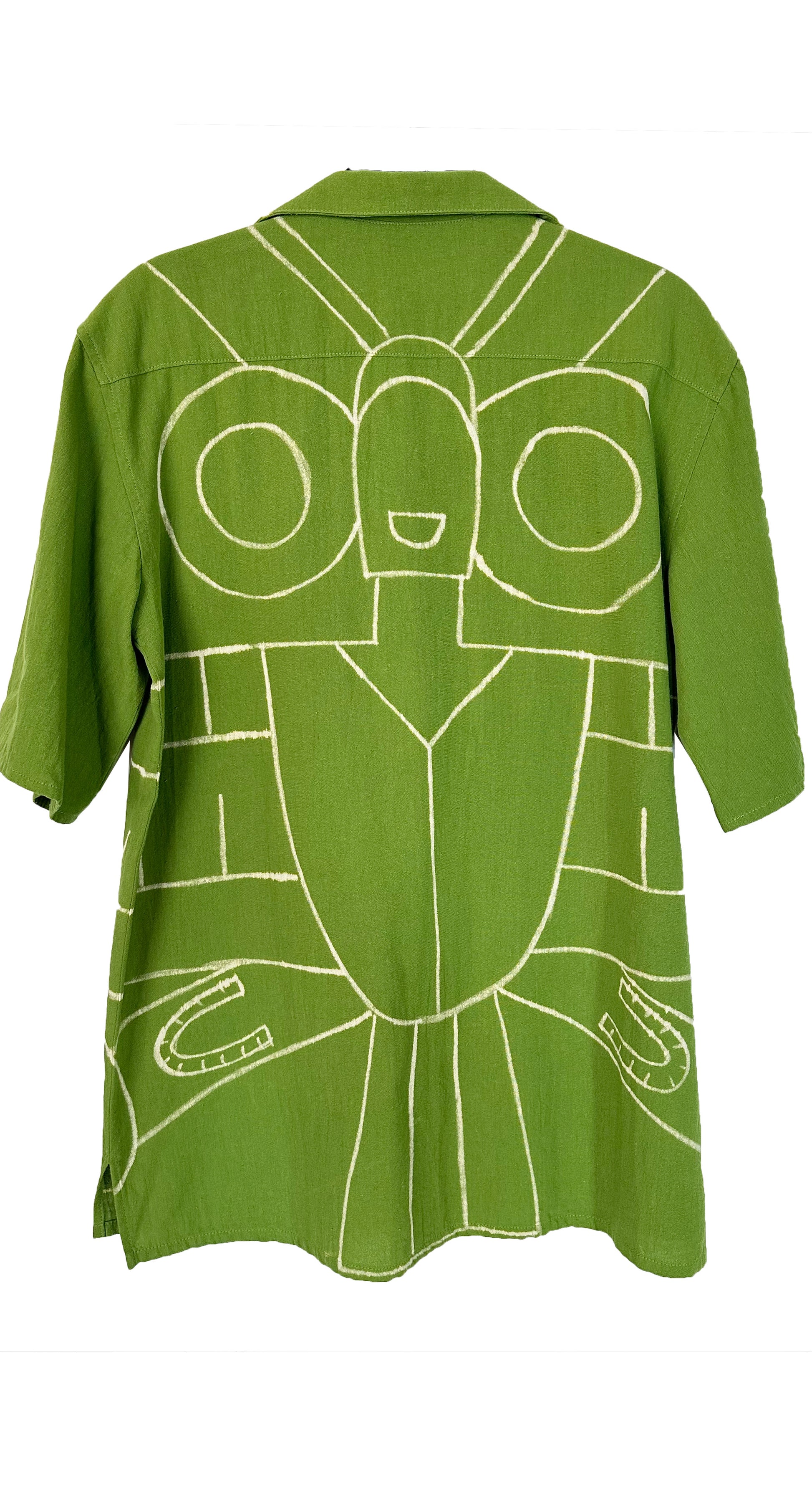 Camisa Murciélago, de corte recto, cuello tipo 70´s, manga corta, cada pieza es dibujada a mano, con técnica de desteñido, una por una por lo que cada una tiene diferencias en las marcas finales.