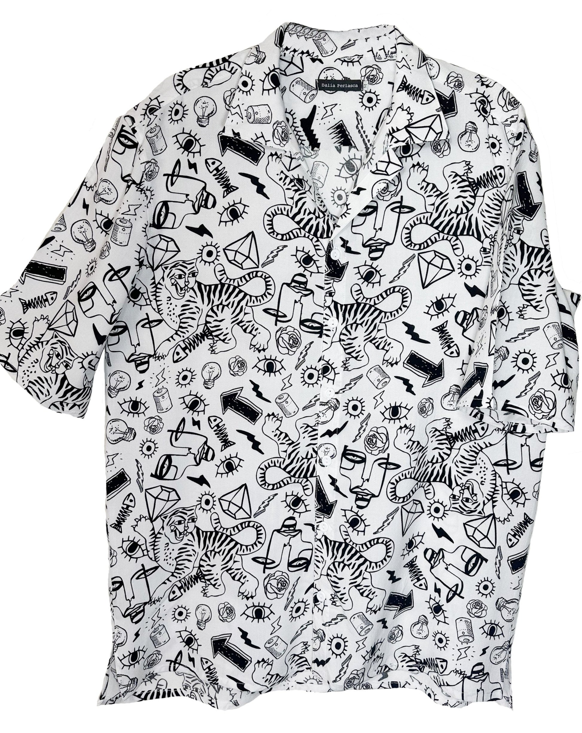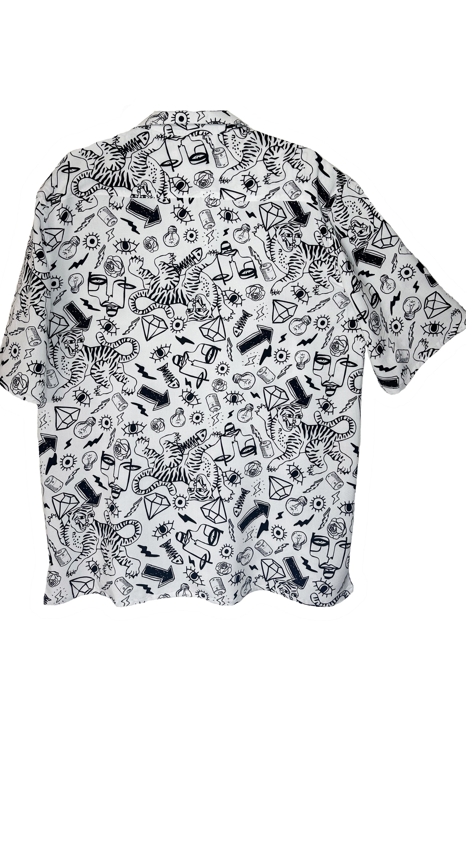 Camisa Tigre, de corte recto, cuello tipo 70´s, manga corta, de tela ligera, muy suave y con mucho movimiento, estampada de un colage de figuras entre ellas un tigre, un ojo, una flecha , etc