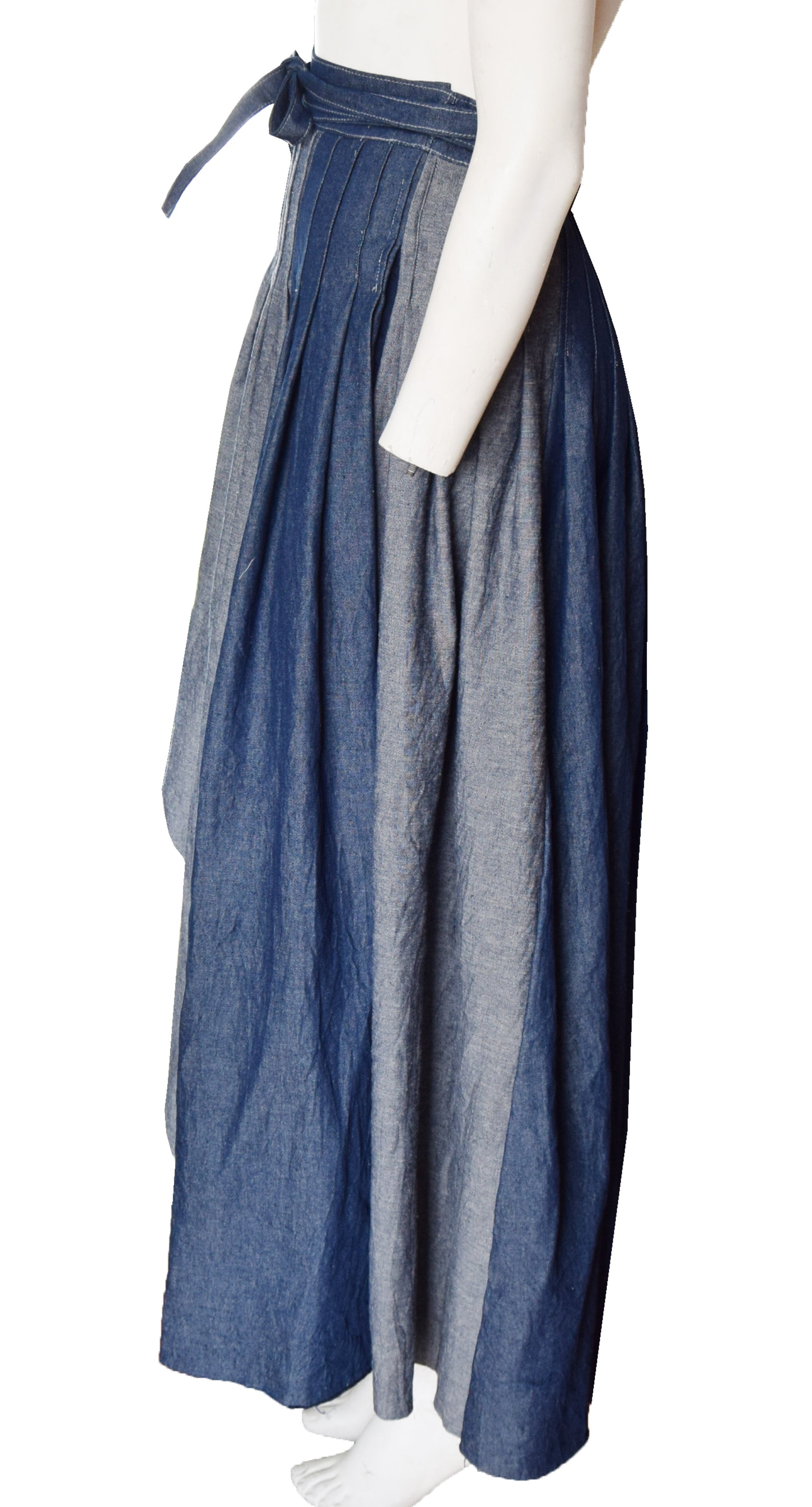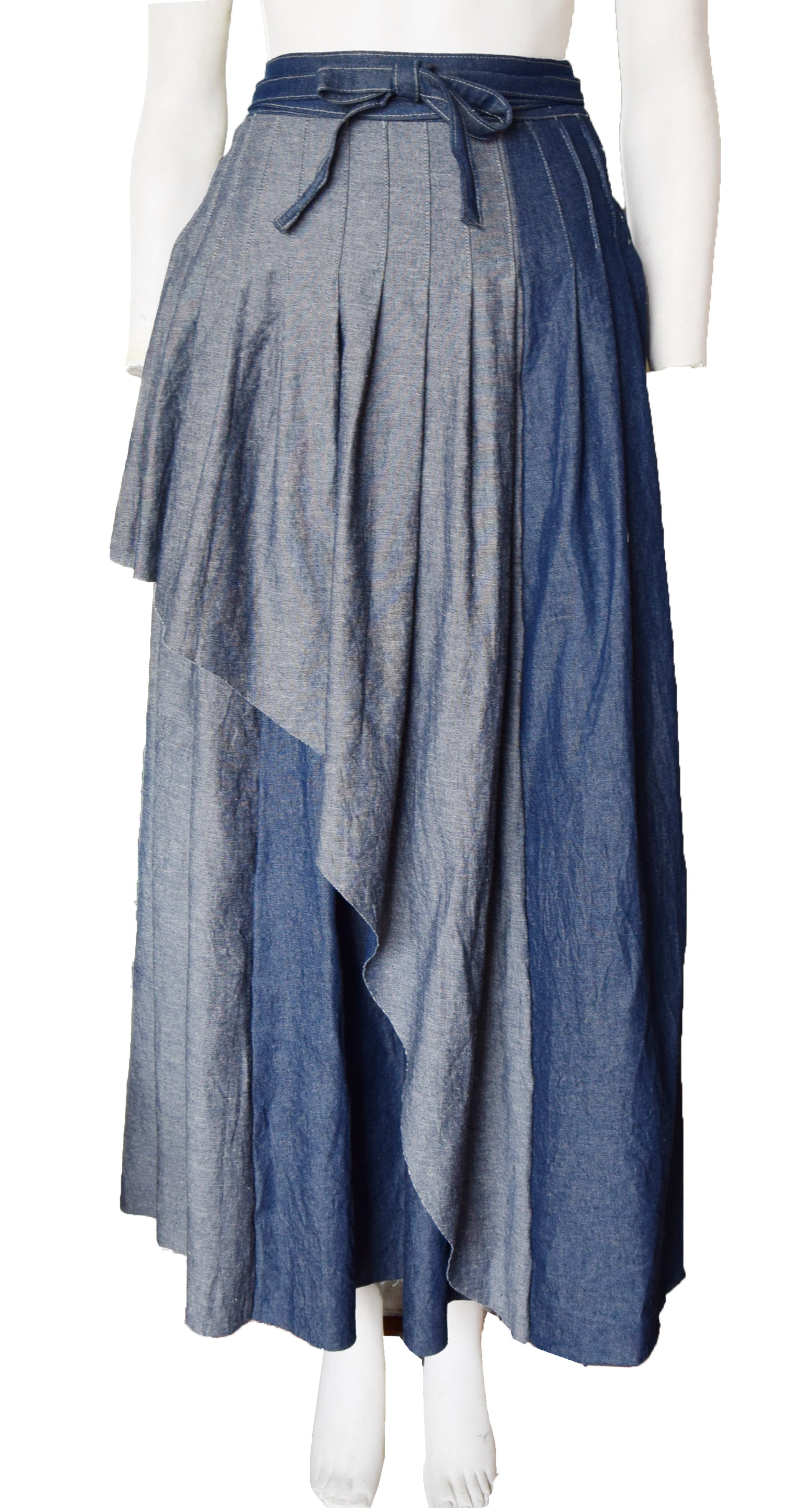 Falda envolvente larga con tablones profundos y corte A, bolsas ocultas en costados, pretina alta, cruzada al frente, con cortes en costados para lograr bloques de colores de mezclilla.