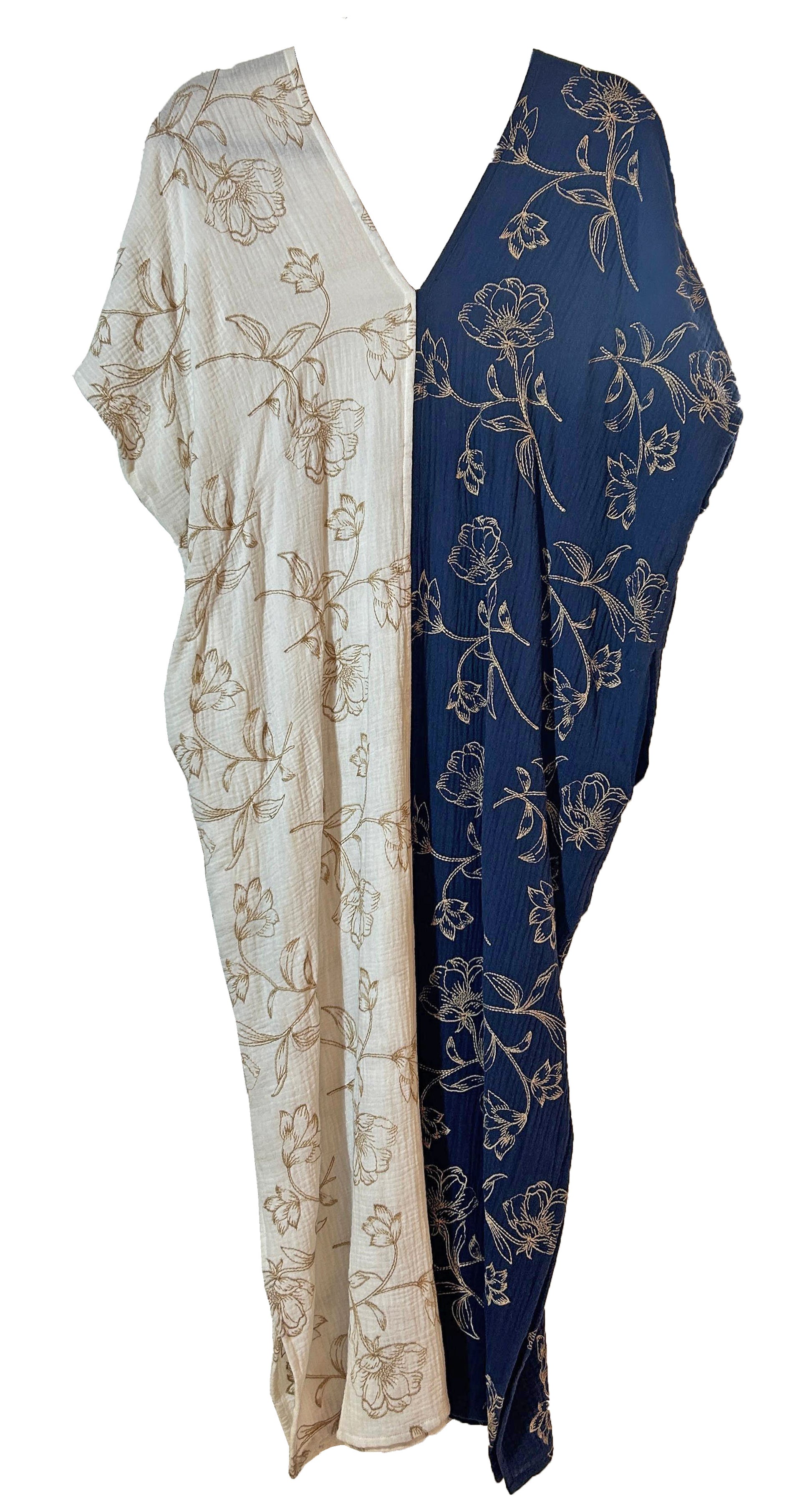 Kaftán, vestido recto muy amplio con cuello. V, dos colores bordados de flores