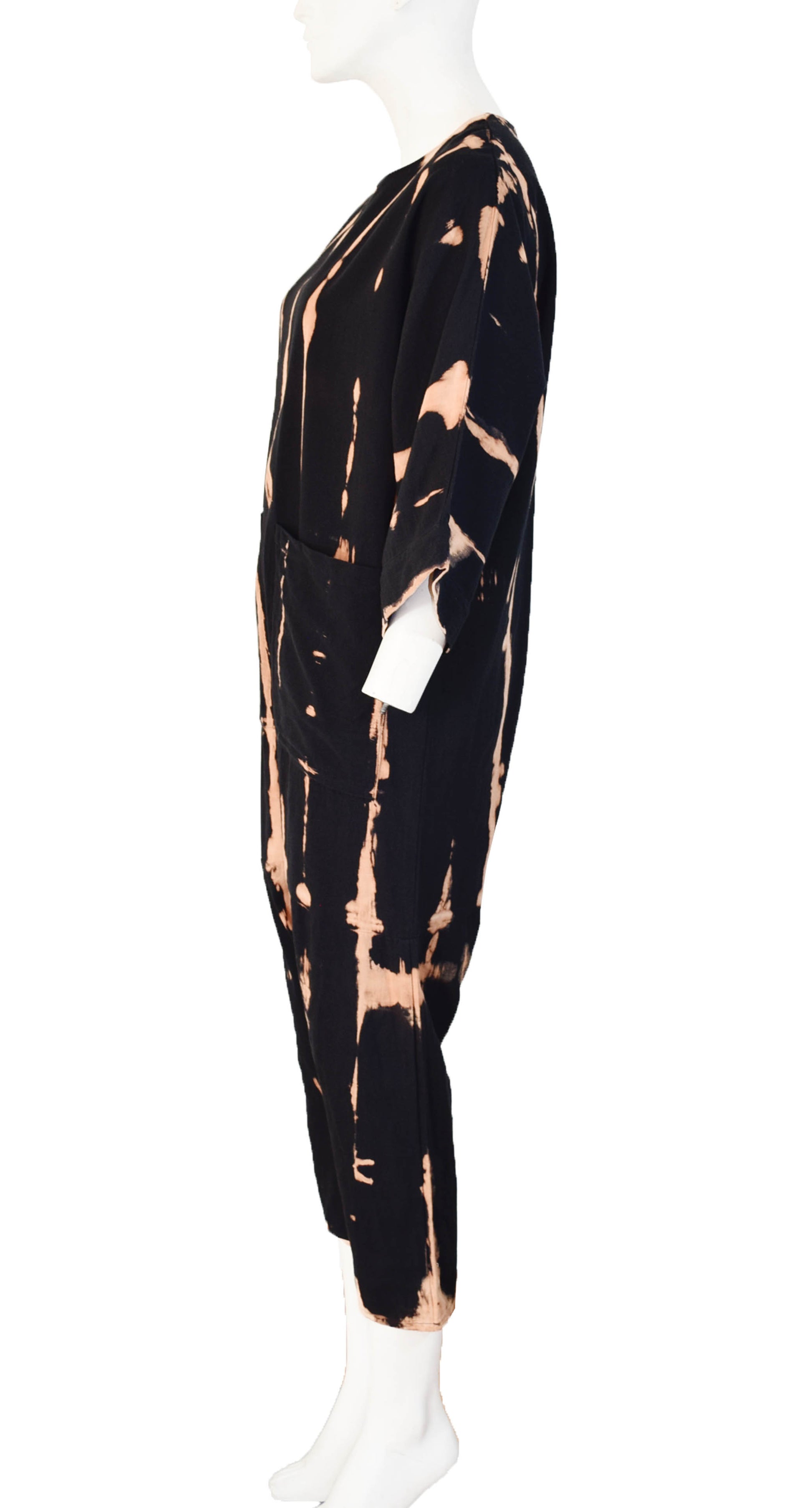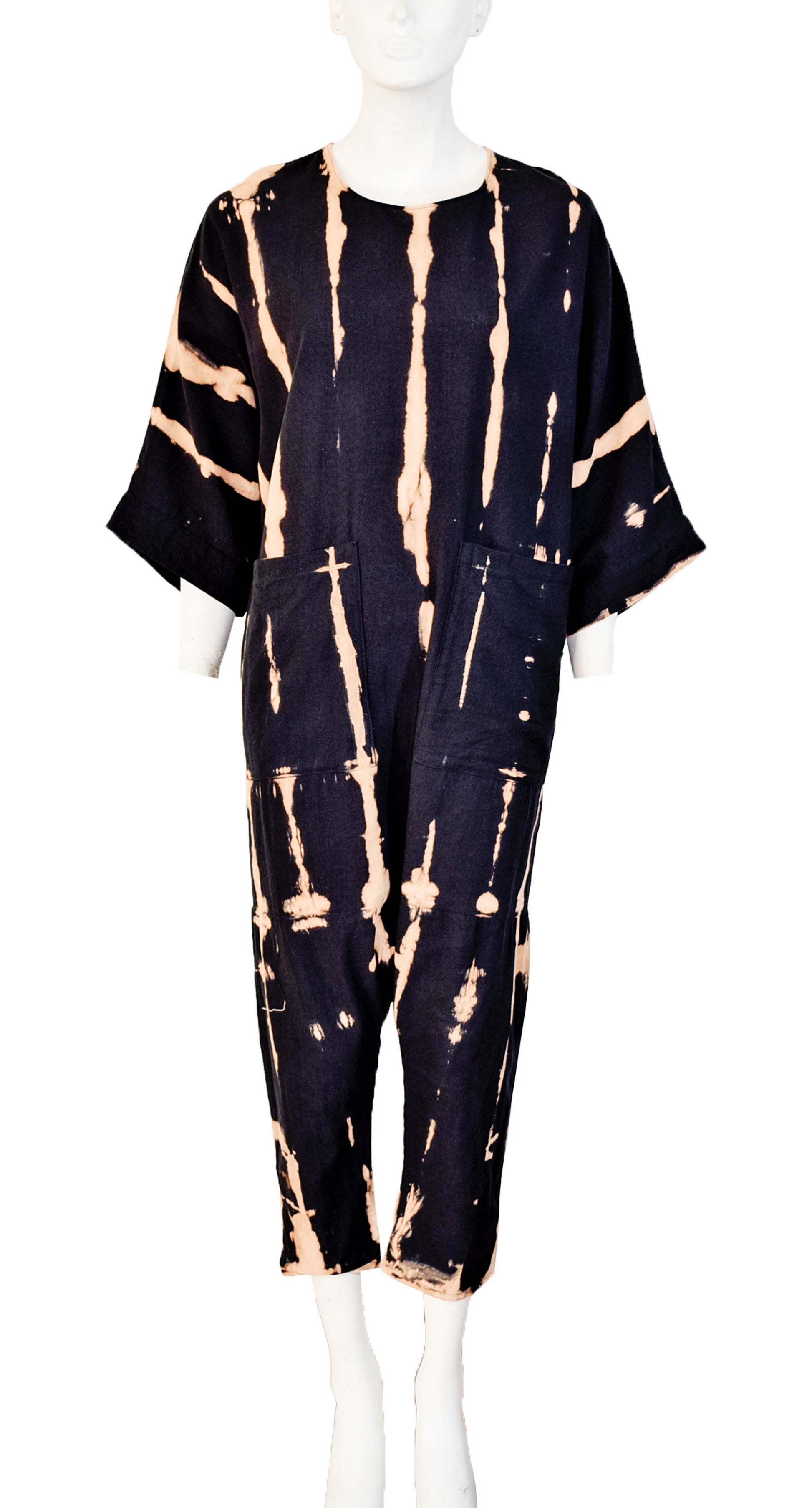 Overall, mono ó jumper oversize, con manga murciélago y tiro bajo, con bolsas rectangulares en detalle al frente. Piezas hechas una por una, con técnica de teñido shibori, sustentable.
