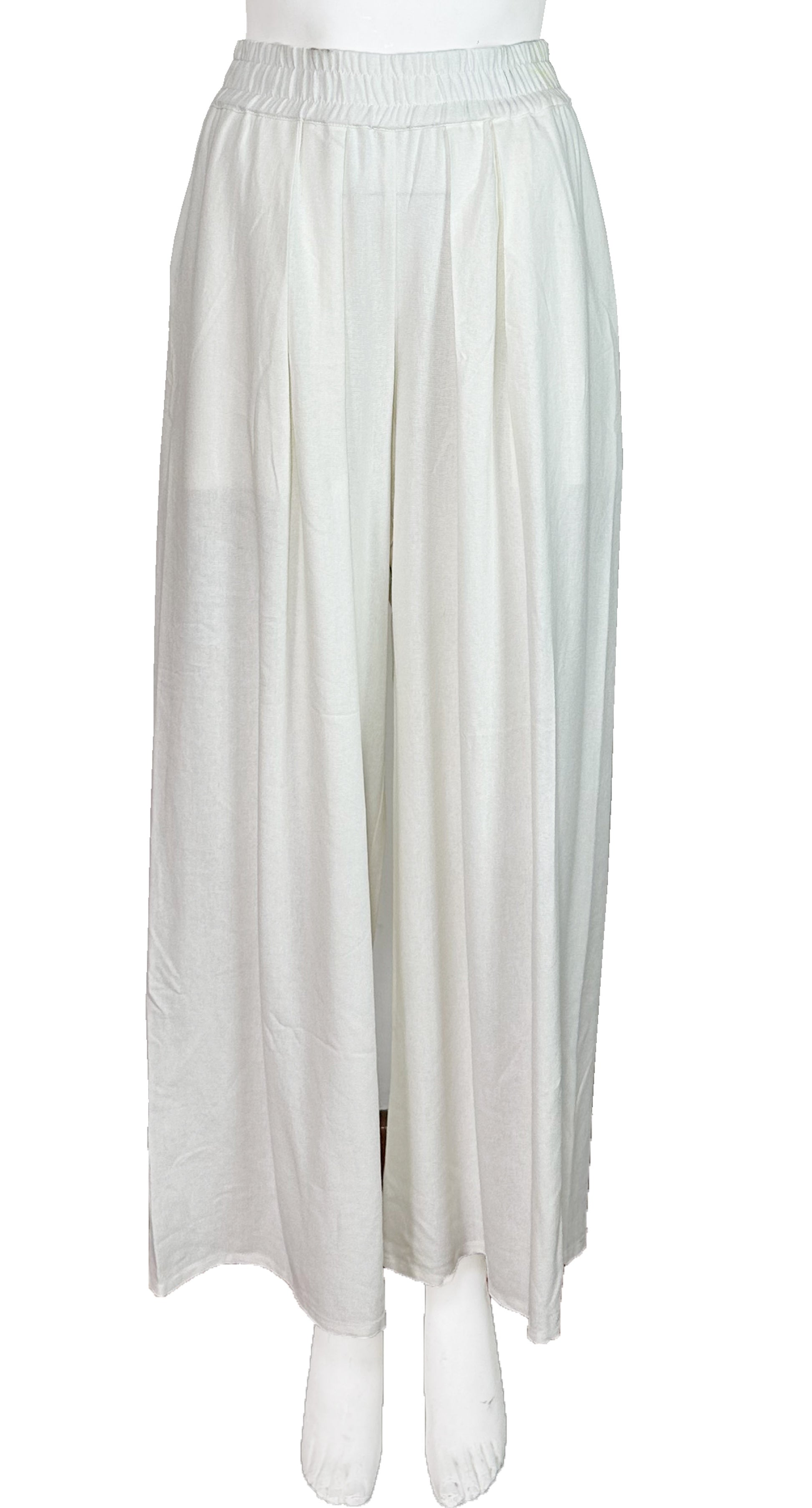 Pantalón de pierna amplia, con 2 tablónes al frente lo que hace la pierna ancha y recta, elástico en pretina cintúra y bolsillos ocultos en costados.