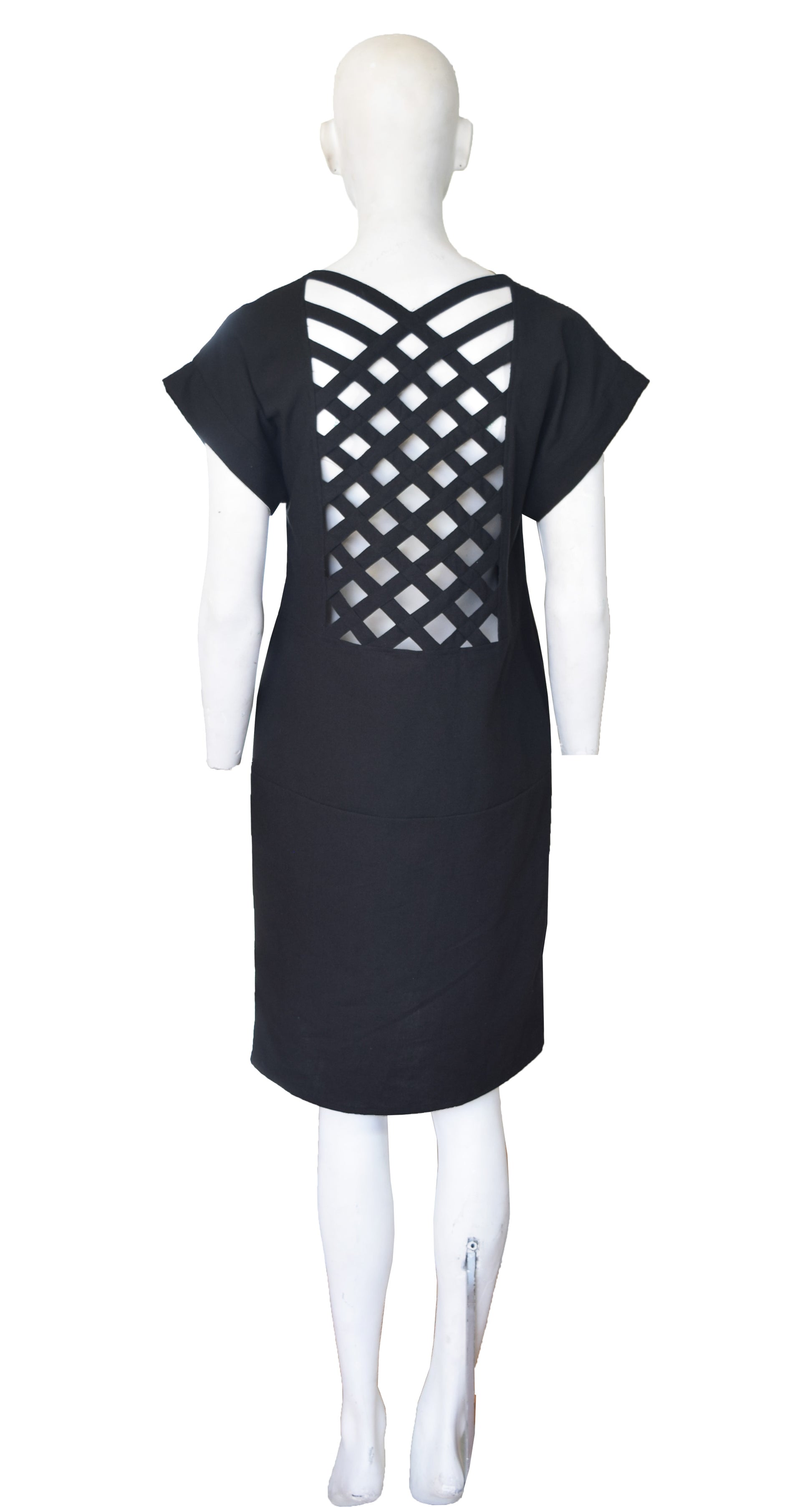 Vestido cuadrado, con bolsas sobrepuestas en frente, cuello redondo y espalda entrelazada.