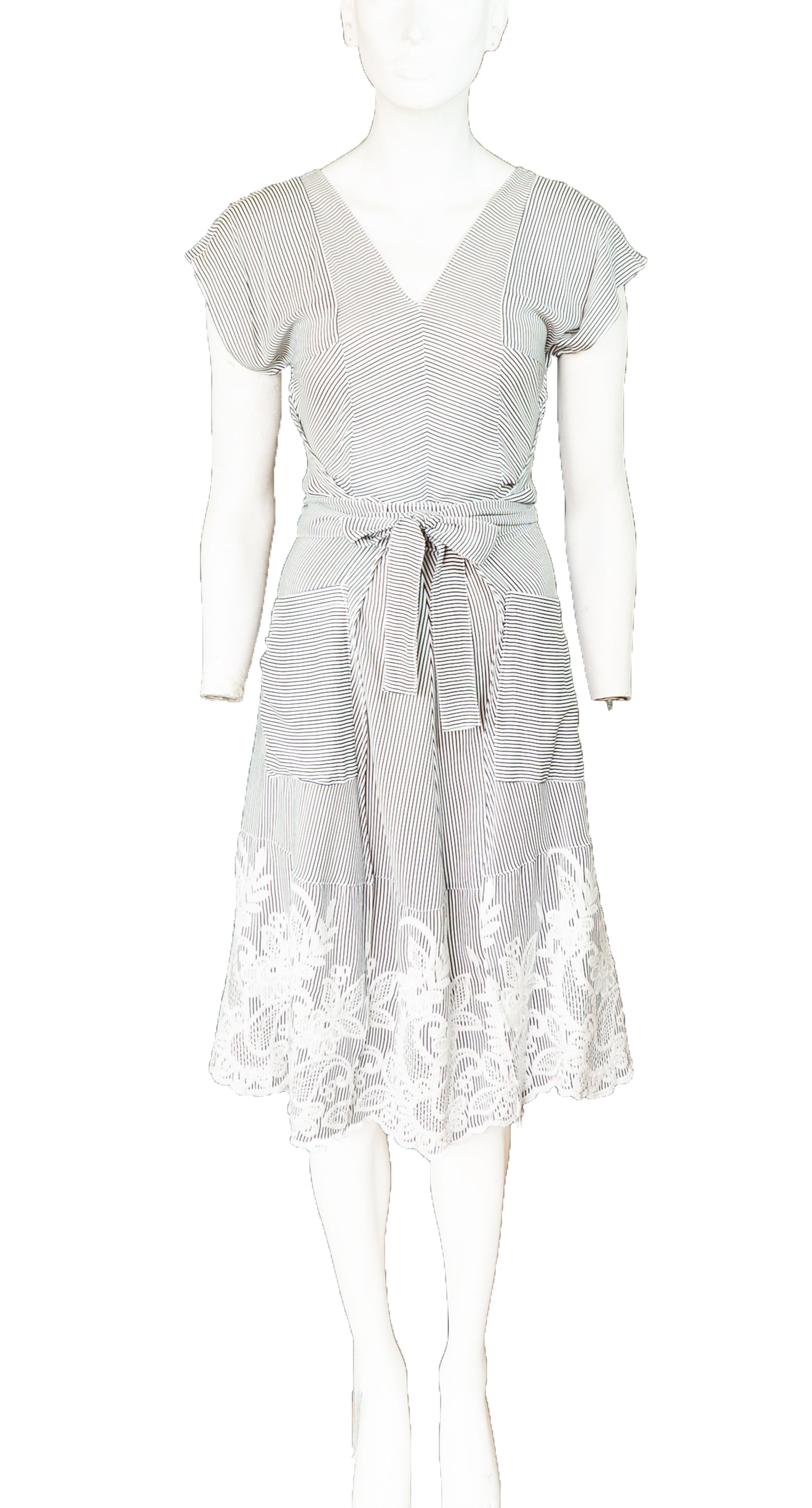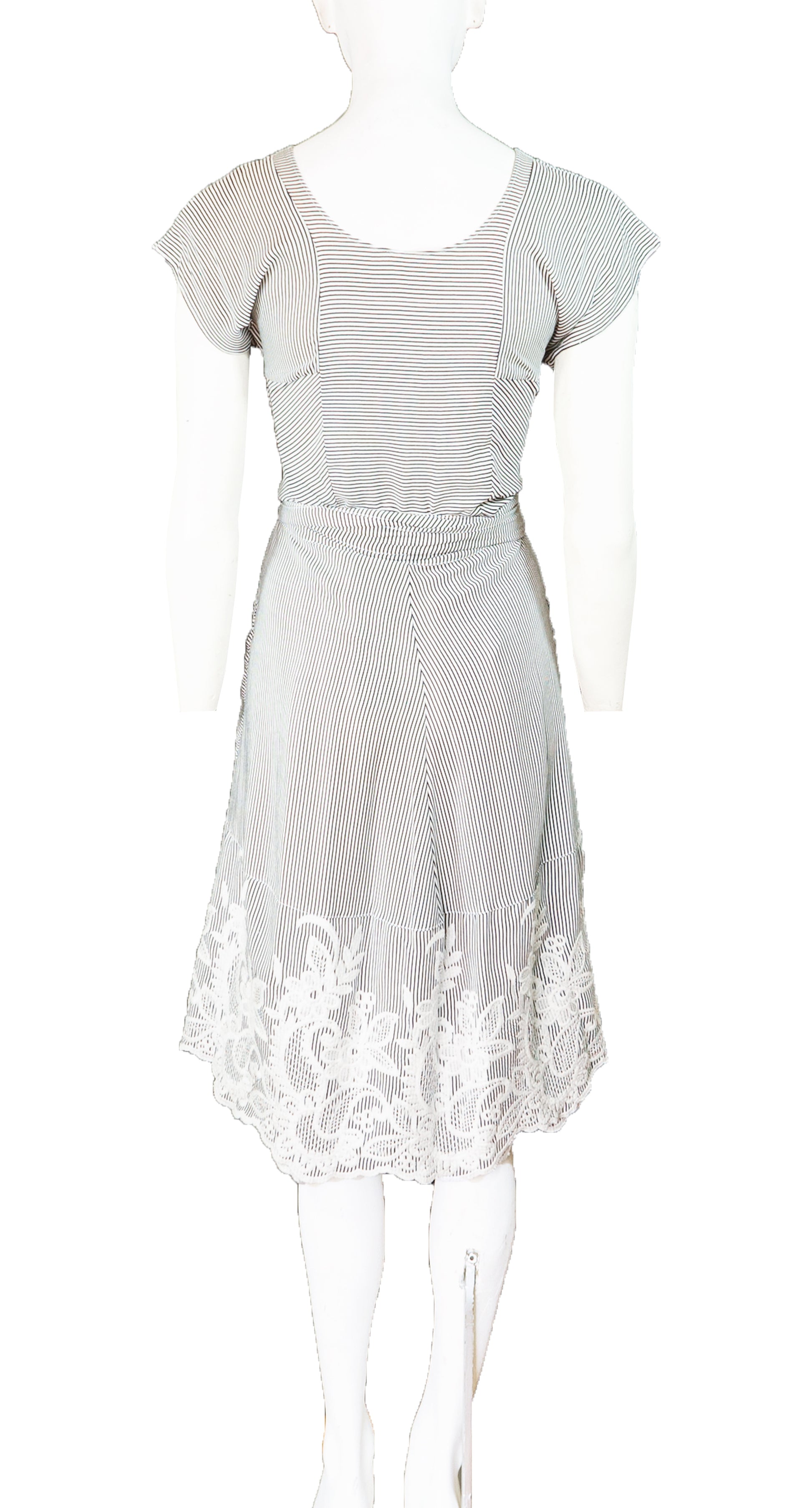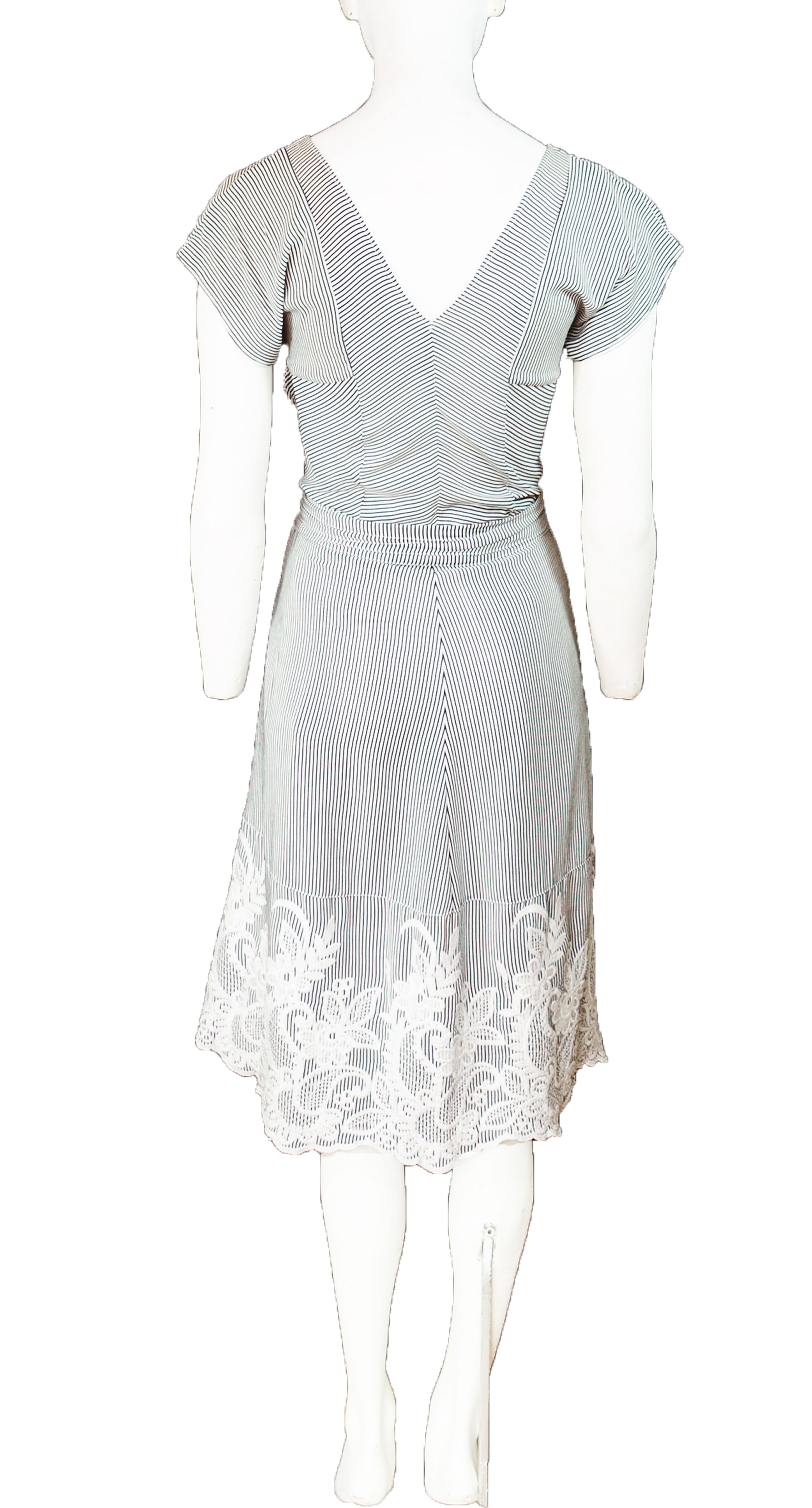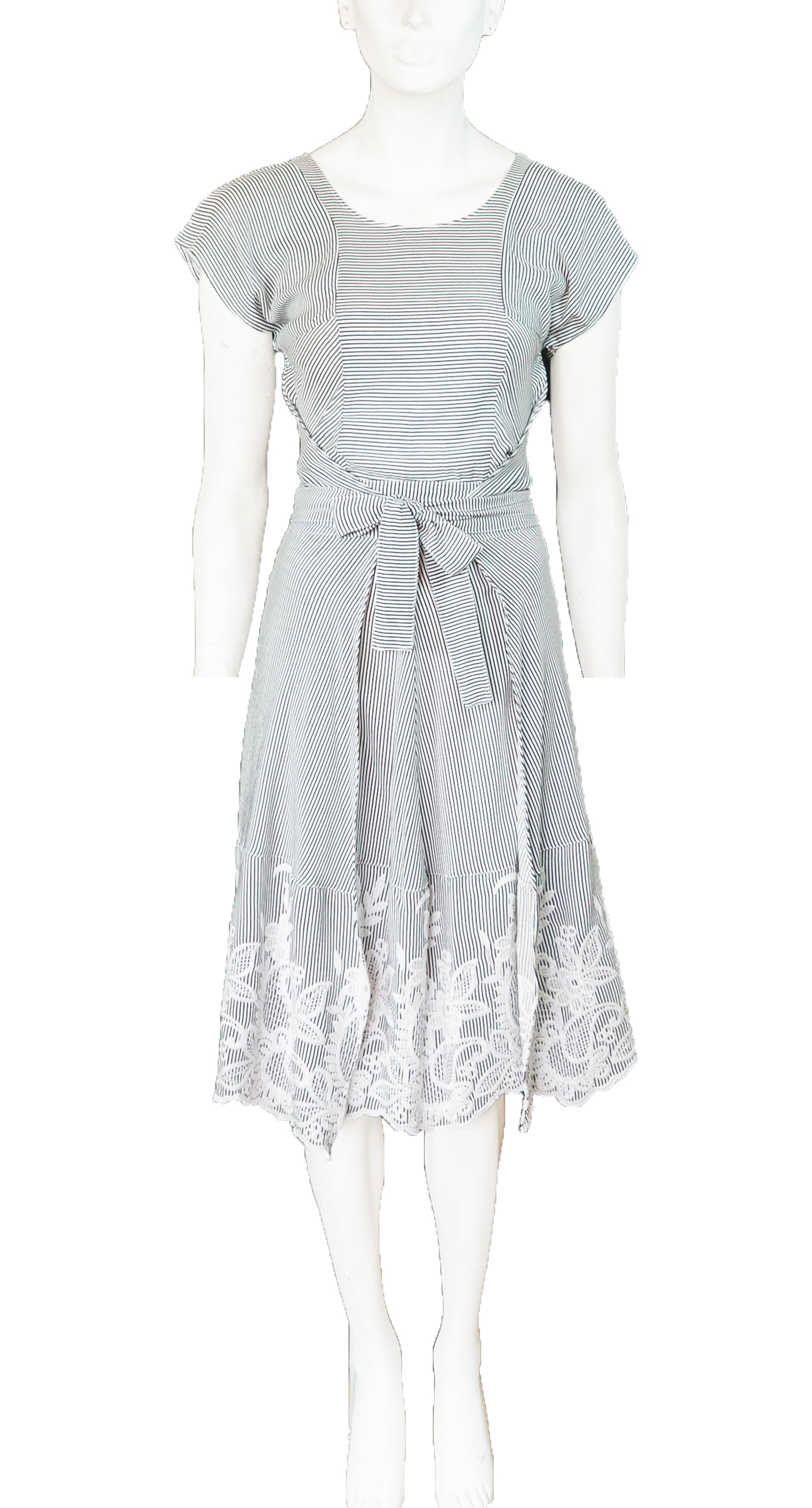 Tela es rayón de rayas delgadas blanco con negro y bordado de flores en ruedo de falda.